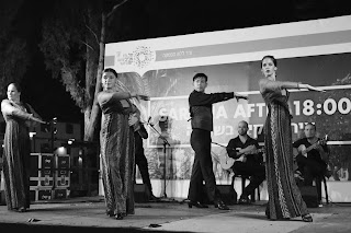 Next part was a solo of Mijal Natan. The only musicians that stayed on stage at this moment were El Fyty and Shuky Shveiky. Mijal was dancing a caña with bata de cola. I think that I saw this dress at one of the shows, but the dance was new to me. And Mijal's dance? Maybe I'm bribed, but Mijal was amazing. No less. That was one of the moments that reminded me why do I love her as a dancer. Elegance at each movement. And the bata de cola dress and the way she used it made her look glamorous. She also a dancer who isn't young. Another proof that flamenco has no age. As someone told me recently - age can be even a good thing in flamenco and make dancers better and more mature. The next problem has started at the end of her dance, but not because of what happened on stage. Somehow all the crazy people find their way to me. So the people behind me at the audience are so "smart" and think that flamenco is nothing more than castanets. They started to talk loud about where are the castanets. Why doesn't she have castanets or anyone else had? I started to look back to them with murder with my eyes. Still didn't make them shut up.
